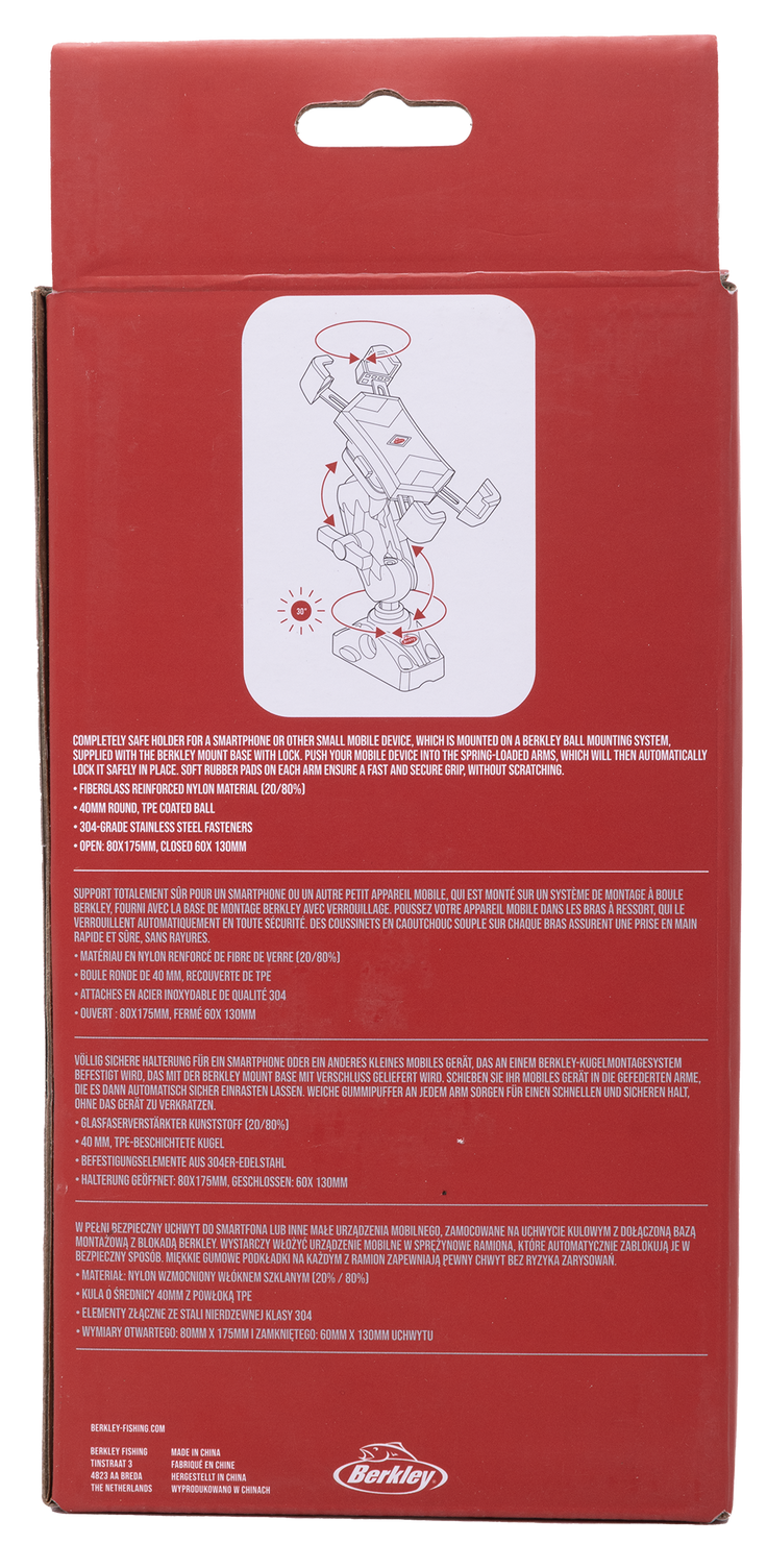 This secure and reliable holder is designed to keep your smartphone or small mobile device firmly in place using the Berkley Ball Mounting System, complete with a locking base. The spring-loaded arms automatically grip your device when inserted, while soft rubber pads prevent scratches and ensure a snug fit.