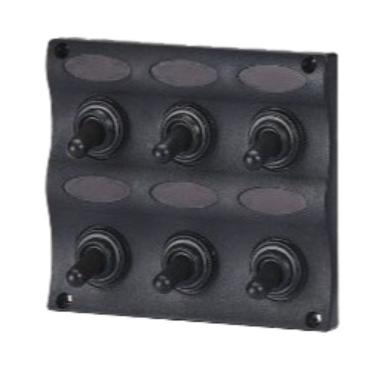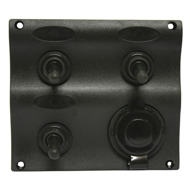 Waterline moulded black panel with fuses and labels. The 3 and 5 gang switch panels incorporate a power take off socket or a USB charging port. Switches can be stacked above or below each other or side by side to create a large bank of switches. The switch panels are weatherproof, have reinforced corners to prevent cracking from screw holes and gaskets for a water tight seal.