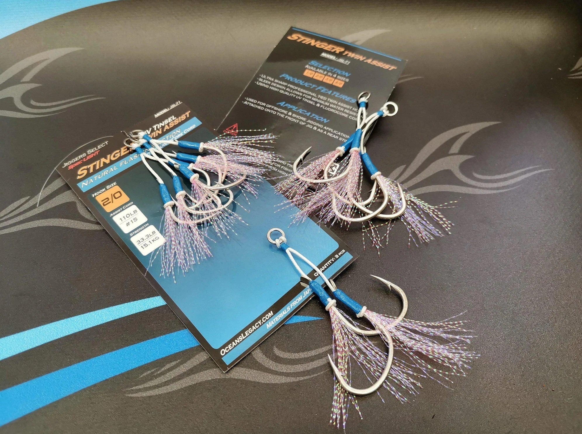 Professionally tied with "Fluorocore Cord" using ultra sharp spade styled slow jigging hooks. Our sleek design allows for minimum water resistance maximising jig action. We use 2 toned high quality UV tinsel to increase bite rates. Our sizes caters for offshore and shore jigging applications including micro, slow pitch and deep drop jigging. Can be attached at the top of jigs and also run as a rear stinger.