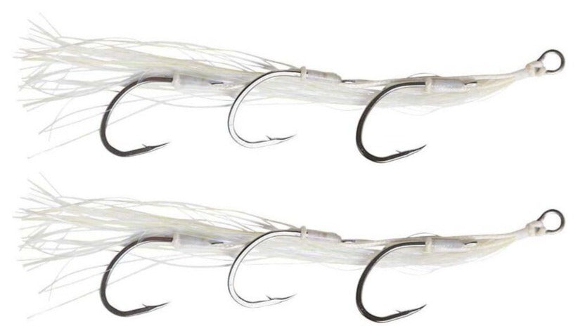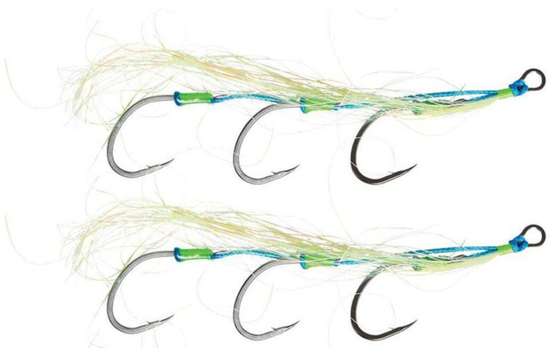 The Vexed Flashy Triple Bait Hybrid Assist Hook can be used as a jig assist, on a bait paternoster rig, or as a Bottom Meat replacement part. The intense flash, glow, and UV combined with a three hook rig results in a highly visible and well presented bait.