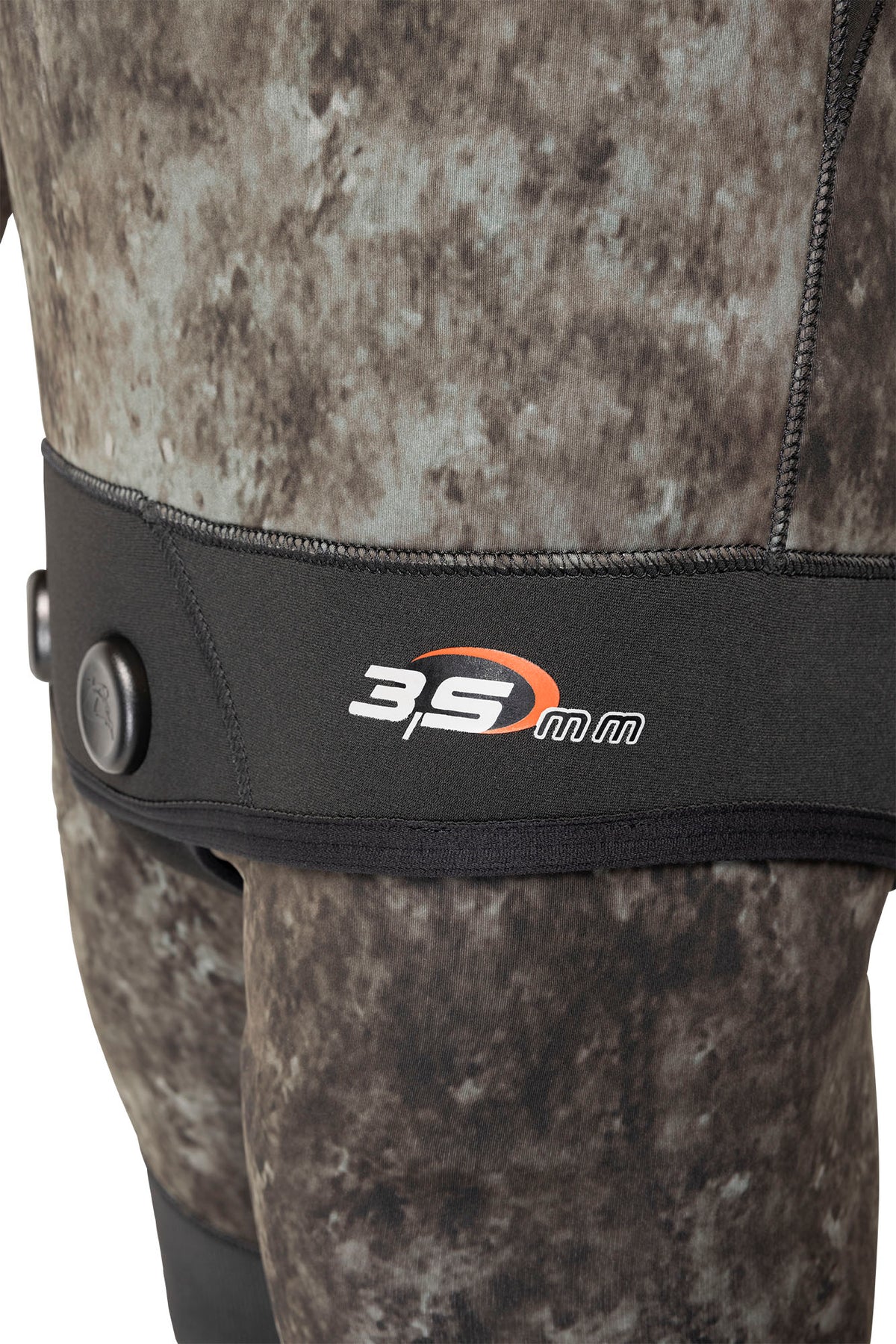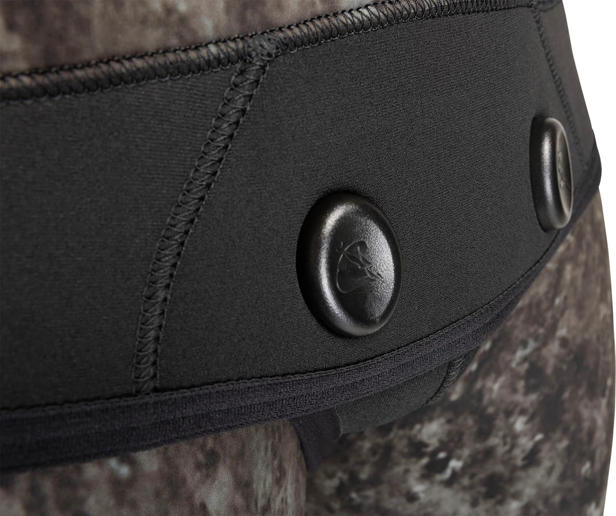 Its standout feature is a digitally engineered dark camouflage pattern that helps divers blend seamlessly with their surroundings, offering superior concealment underwater. The set includes high-waisted pants and a hooded jacket, both reinforced in key areas for durability. Smoothskin watertight seals on the hood, wrists, waist, and ankles help retain warmth, while reinforced elbows, knees, and chest provide added protection and support—especially important when reloading spearguns. Glued and sewn seams ensure strength and longevity, making this suit a trusted companion for serious underwater hunts.