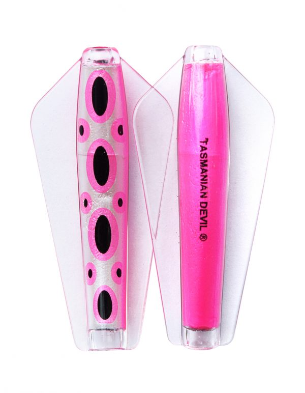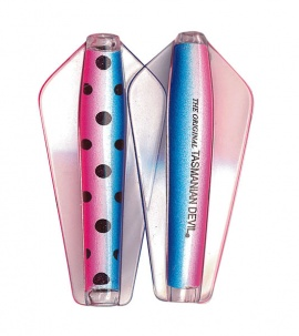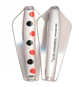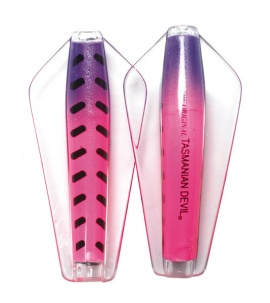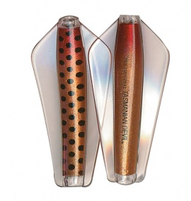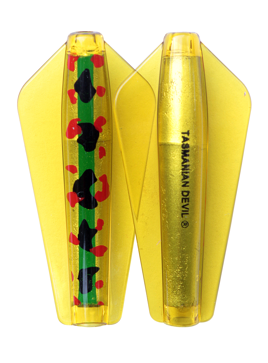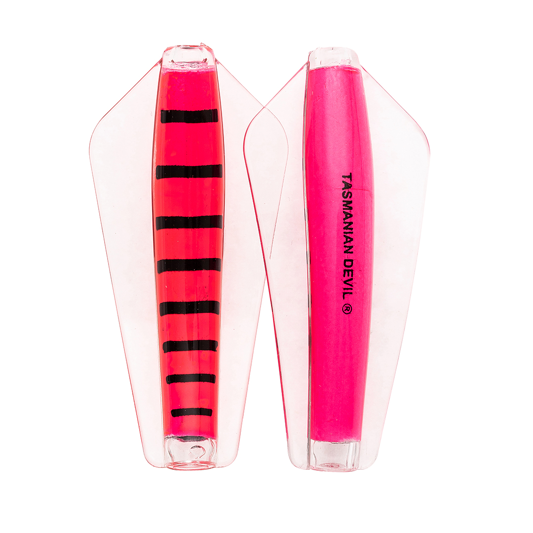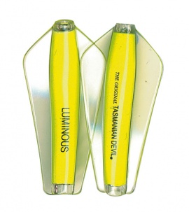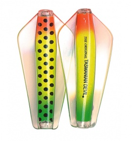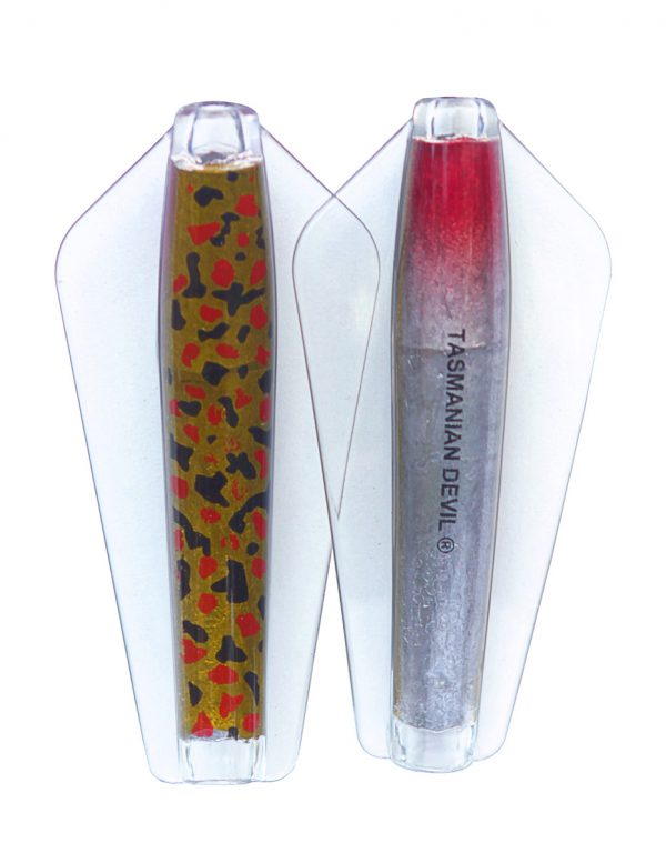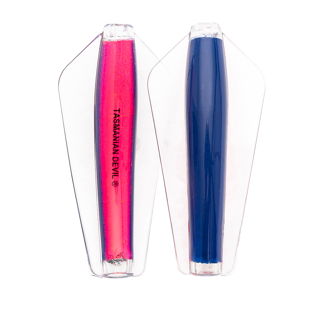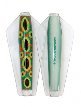 Tasmanian Devil lures are an innovative Australian design crafted for trolling, casting, or jigging in both fresh and saltwater environments. Their distinctive swimming action comes from advanced winged technology, causing erratic, darting movements that mimic injured fish. This pulsating motion is visible as a nodding tip on the rod, confirming proper lure action; absence of this indicates either weed contact or a hooked fish. All five sizes exhibit this unpredictable swim pattern, contributing to their effectiveness. The 7g and 13.5g models feature loose flight stainless steel or line-through rigging, allowing the lure to slide along the line and reduce hook loss. Suitable for a wide range of species from Brown and Rainbow trout to School Mackerel and Salmon, the Tasmanian Devil is a versatile, reliable lure that casts easily, trolls smoothly, and jigs effortlessly..